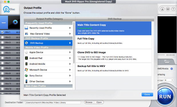 Затем нам нужно создать выходной профиль — это на самом деле не так сложно, так как Mac DVD Ripper Pro уже установил многие из них. Вам просто нужно выбрать один! Если вы выполняете резервное копирование на сетевое хранилище (NAS) или USB и не заботитесь о размере файла, возможно, вы захотите сделать резервную копию на DVD. Это создает резервные копии файлов формата DVD без какого-либо сжатия, поэтому вы, естественно, получите большой размер. Выберите параметр «Резервное копирование DVD», а затем выберите «Копирование основного заголовка содержимого» или «Полное копирование заголовка», или вы можете выбрать «Резервное копирование полного заголовка на MKV» — это сохранит ваш DVD в формате .mpg или .mkv со 100% исходным качеством содержимого. Есть и другие форматы файлов, которые вы можете выбрать.