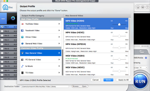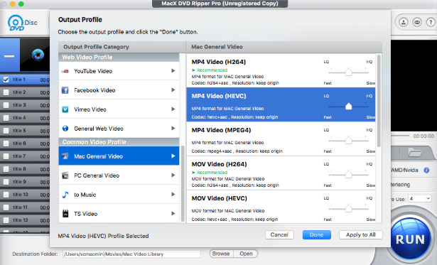 Если вы хотите, чтобы файл был еще меньше, снова — в Профиле вывода — прокрутите весь путь до раздела «Общее видео Mac» и выберите MP4 VIDEO (HEVC). Это новый стандарт сжатия видео — он в два раза меньше H.264, но, опять же, вы получаете оригинальное качество DVD. Хорошая вещь об этом заключается в том, что — если у вас довольно большая коллекция DVD, этот новый процесс позволяет вам сохранить еще больше файлов DVD на вашем компьютере.