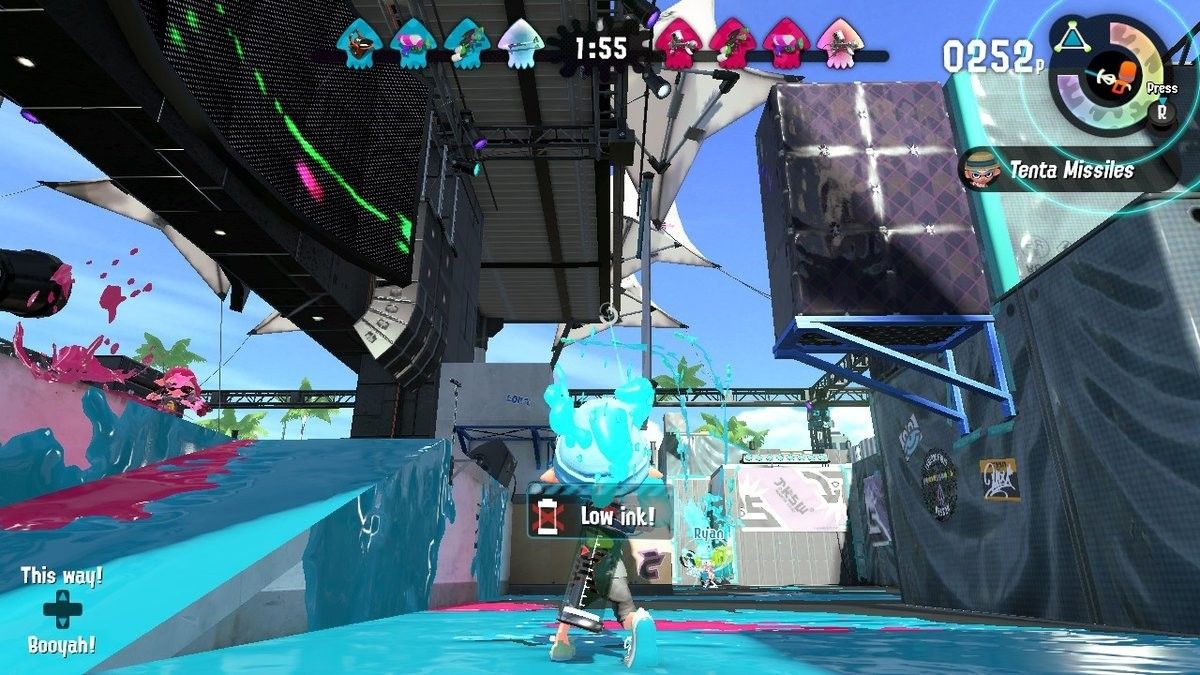Ваш персонаж несет флакон с чернилами на спине, так что вы можете следить за тем, сколько у вас осталось. Единственный способ пополнить свою чернильницу — это пройти через чернила своей команды в форме кальмара.