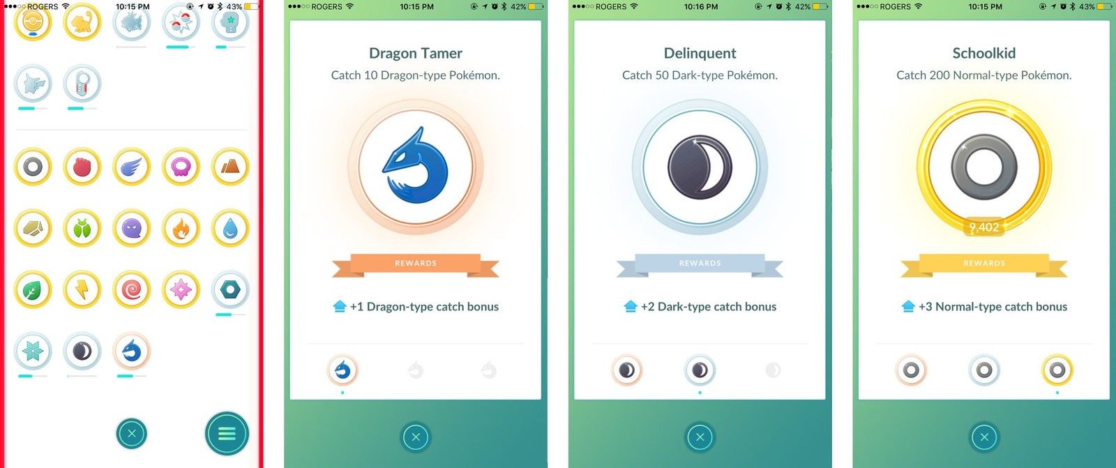 Вы получаете типовые медали за поимку покемонов определенного типа: