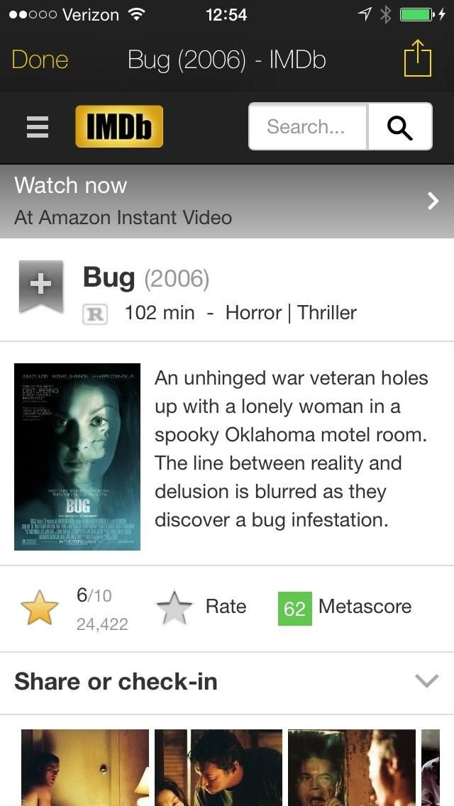 Он даже показывает вам веб-страницу IMDb для фильма, когда вы нажимаете на выбор фильма. Оттуда вы можете нажать на значок «Поделиться» и открыть страницу в приложении IMDb.