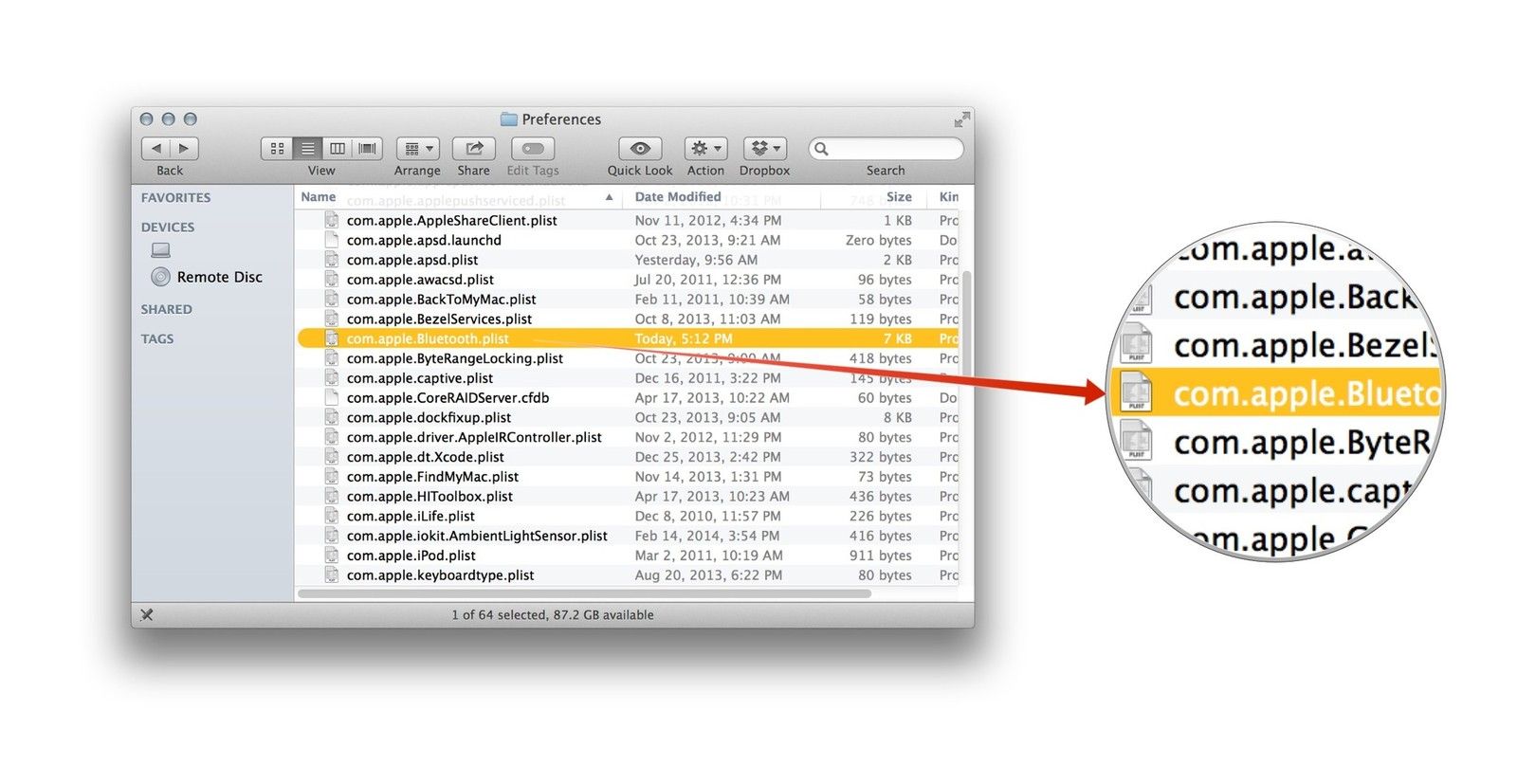 - Найдите файл с именем «com.apple.Bluetooth.plist»