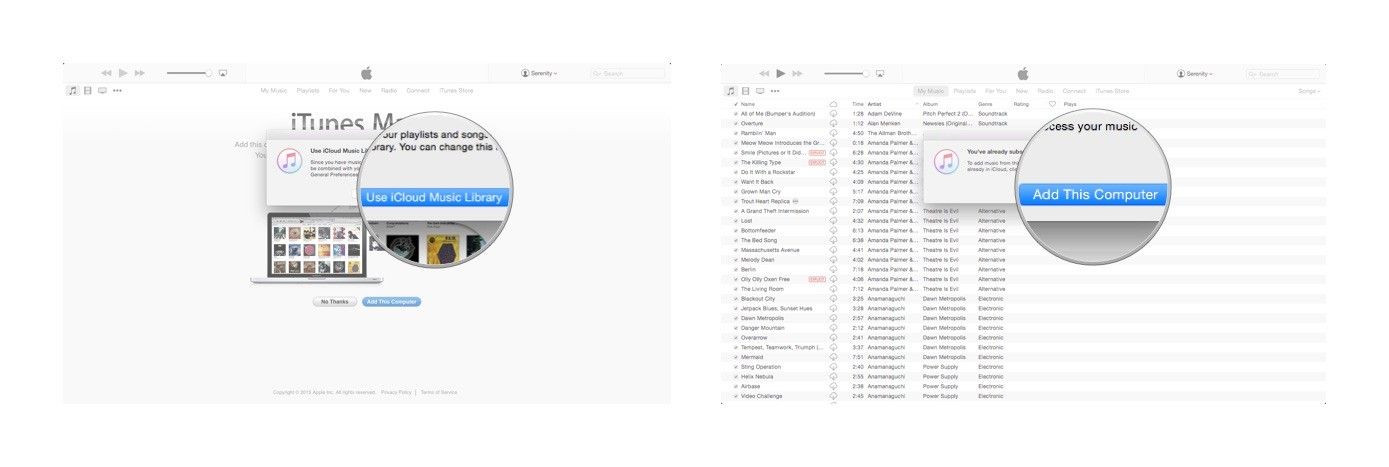 - Нажмите Добавить этот компьютер для загрузки и сопоставления музыкальной библиотеки вашего компьютера с iCloud Music Library. (Этот шаг может произойти автоматически, поэтому не паникуйте, если вы его не видите.)
